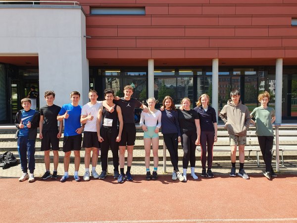 Bei sonnigem Wetter sind am heutigen Mittwoch, dem 03.05.2023, drei Mannschaften unseres Gymnasiums bei den Staffelmeisterschaften des Bezirkes Pankow in der Disziplin 4 x 100m angetreten. Nach anfänglichen Anspannungen und einer dem Wettbewerb geschuldeten Aufregung startete die jüngste Gruppe, die Jungen der Jahrgänge 2008 und jünger. Die Gruppe gewann ihren Lauf in der Zeit von 50,1s und belegte damit den 1. Platz in ihrer Wettkampfsklasse im Bezirk Pankow.