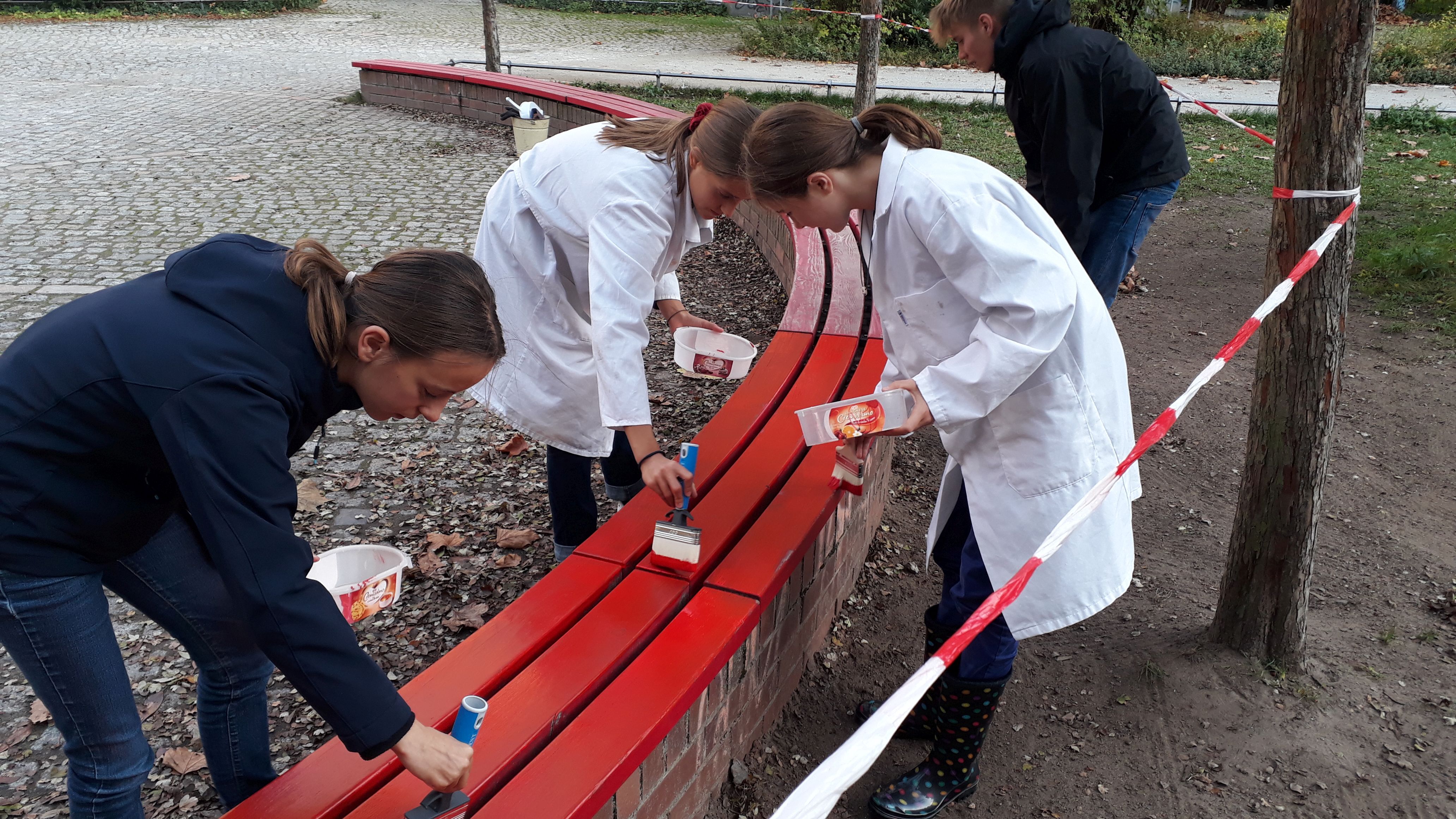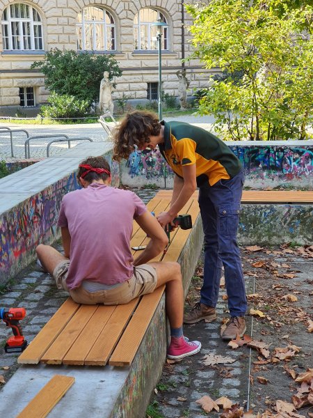 Endlich konnte der erste Schritt hin zu mehr Sitzmöglichkeiten auf dem Schulhof gegangen werden. Der beste Rasen hält so viele Füße jeden Tag einfach nicht aus. Die Fläche war sehr unansehnlich geworden - und hinsetzen konnte man sich auch nicht.