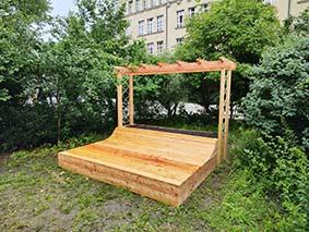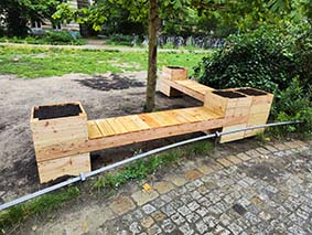 Dank einer Kooperation mit den "Baufachfrauen" war es möglich, über erste grundlegende Ideen der Schüler:innen des Wahlpflichtkurses von Frau Etterich-Rätz hin zu fertigen Entwürfen rund abschließend zur baulichen Umsetzung zu kommen. Zu Beginn des neuen Schuljahres sollen die Kübel bepflanzt werden, so kurz vor den Sommerferien lohnt sich das nicht mehr. Namensschilder aller Beteiligten werden ebenfalls noch angebracht. Die tollen Ergebnisse sieht man hier.