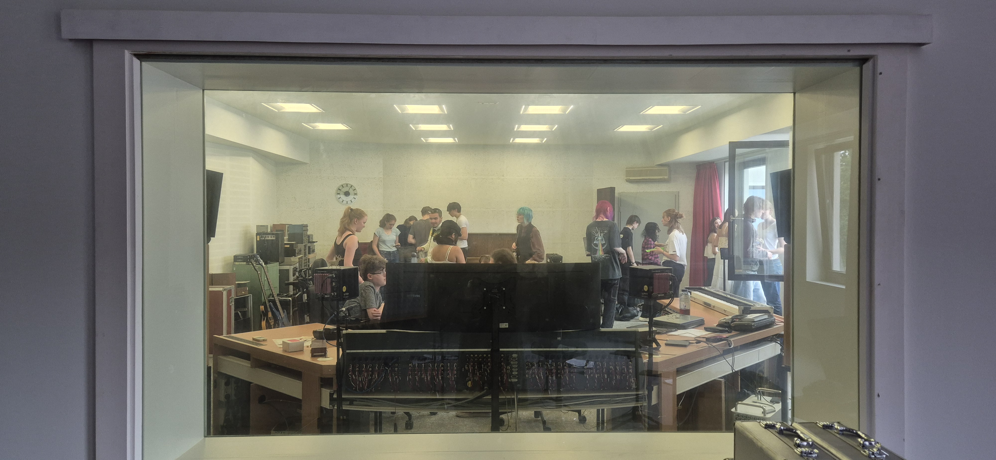 Blick vom Aufnahmeraum ins Studio zur Pausenzeit. Während der Aufnahmen lief die Kommunikation mit dem Tonmeister nur über Lautsprecher und Mikrofon.