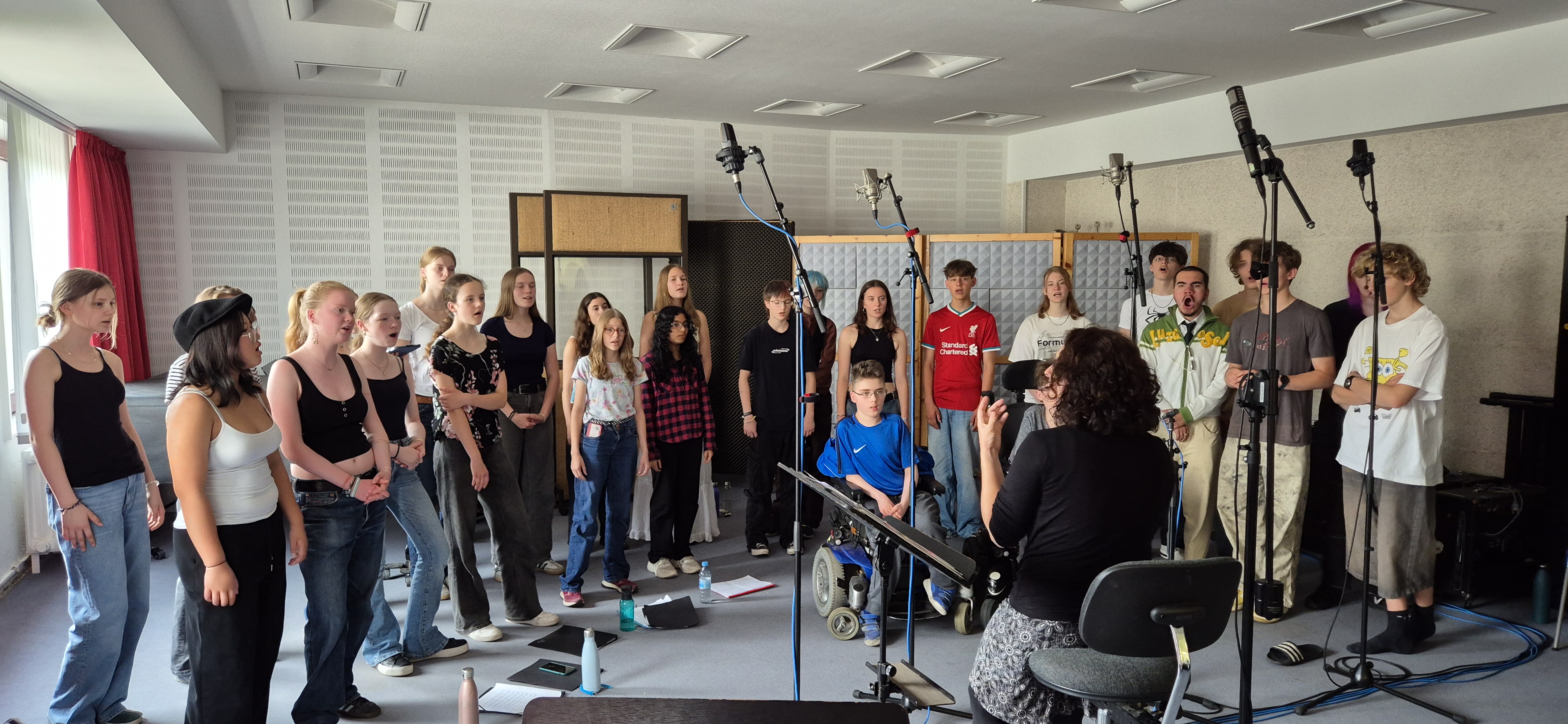 Am 10. Juli waren wir zu Gast in der Landesmusikakademie im FEZ Berlin, um unseren Preis vom 2. Berliner Schulchorpreis einzulösen: Professionelle Tonaufnahmen unseres aktuellen Repertoires. Trotz hoher Temperaturen im Aufnahmeraum sangen wir fünf Lieder ein - mit Konzentration, Ausdauer und vielen kleinen Pausen zum Lüften. Der Tonmeister war beeindruckt vom homogenen Chorklang und dem engagierten Mitwirken der Schüler*innen.