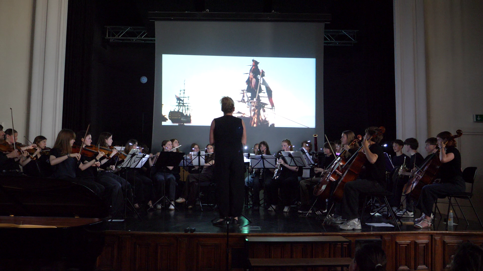 Am Donnerstag, den 19. Juni 2025, verwandelte sich unsere Aula in eine Bühne für großes Kino – musikalisch. Im diesjährigen Filmmusikkonzert konnte das Publikum Arrangements beliebter Soundtracks aus Klassikern über Action bis zu Videospielmusik erleben - interpretiert vom Schulorchester und unterlegt mit eigens für das Konzert von Schüler:innen fantastisch geschnittenen Filmszenen.