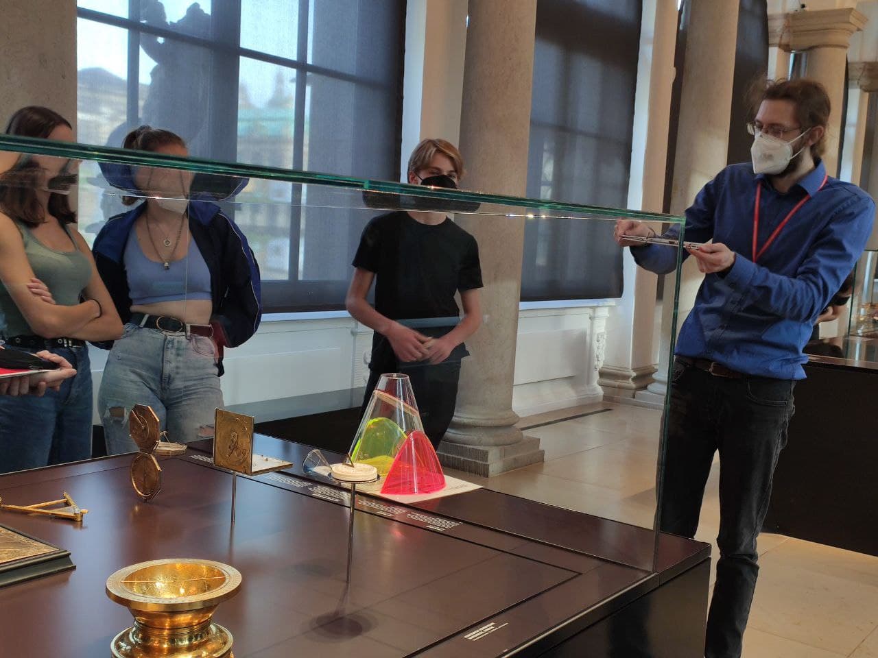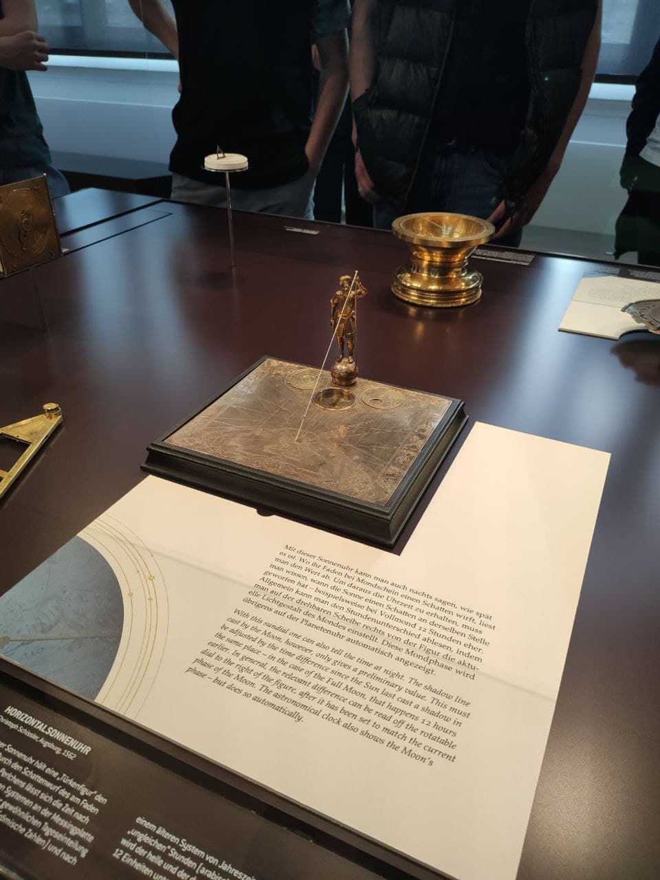 Zunächst stellte uns aber Volkswagen seine Gläserne Manufaktur vor, in welcher wir den Bau eines Elektroautos hautnah mitverfolgen konnten, um dann am frühen Abend die fußläufig erreichbare Altstadt zu erkunden. Aufbauend auf dem Dresdner Zwinger, dem Residenzschloss, der Semperoper Dresden und dem Schlossplatz mit der Katholischen Hofkirche wurden wir am Donnerstag über die Elbe nach Loschwitz chauffiert. Loschwitz bietet heutzutage malerische Fachwerkhäuser und natürlich das Blaue Wunder. Ein Wunder ist in jedem Fall die dem Eiffelturm nachempfundene Bauweise der Brücke, die uns dann sicher zum Mathematisch-Physikalischen Salon brachte. Nun darf auch wieder der Spruch aus der Kindheit erwähnt werden, welcher einen wichtigen Teil beim Verständnis von Sonnenuhren ausmacht. Zur Vorbereitung gab es eine knappe Wiederholung zu Sternbildern und Globen, um dann die Komplexität höherer Sonnenuhren zu verstehen. Damit die Spannung des Widerlegens endlich gebrochen wird, sei gesagt, dass der Spruch nicht ganzjährig volle Gültigkeit besitzt. Wohl eher können durch die Abweichungen das Datum und sogar die Zeit in der Nacht bestimmt werden.