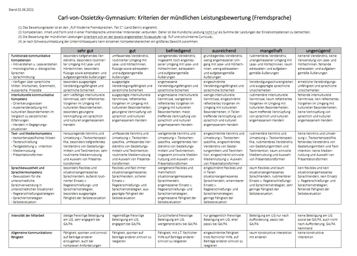 Alle Lehrkräfte am CvO verwenden einheitlich dieses Kriterienraster zur Bewertung der mündlichen Mitarbeit.